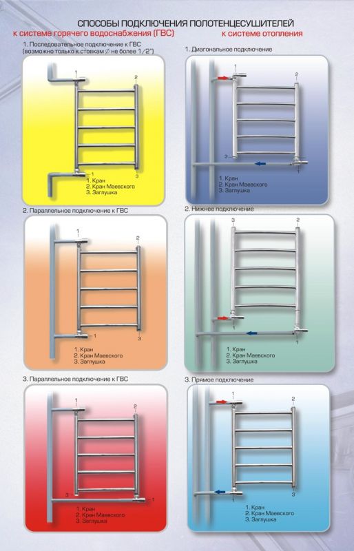 Способы установки и подключения полотенцесушителей к системе отопления и водоснабжения.